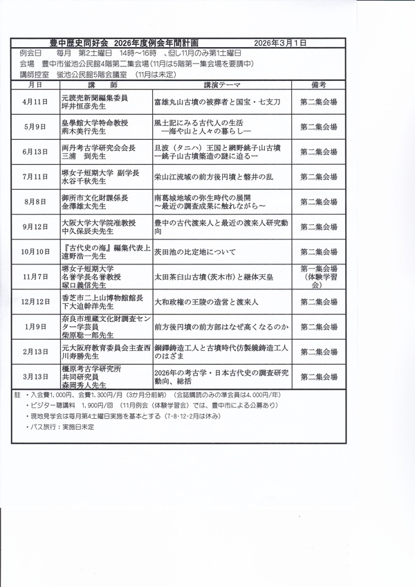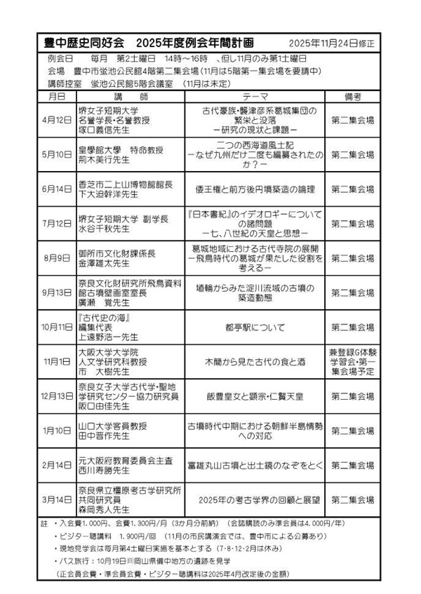 毎月第2土曜日豊中市蛍池公民館(ルシオーレビル)4階第二集会場 開場・受付開始13時、講演時間14時開始、16時終了ビジターの方は聴講料1,900円/回が必要です(2025年4月改定)。
